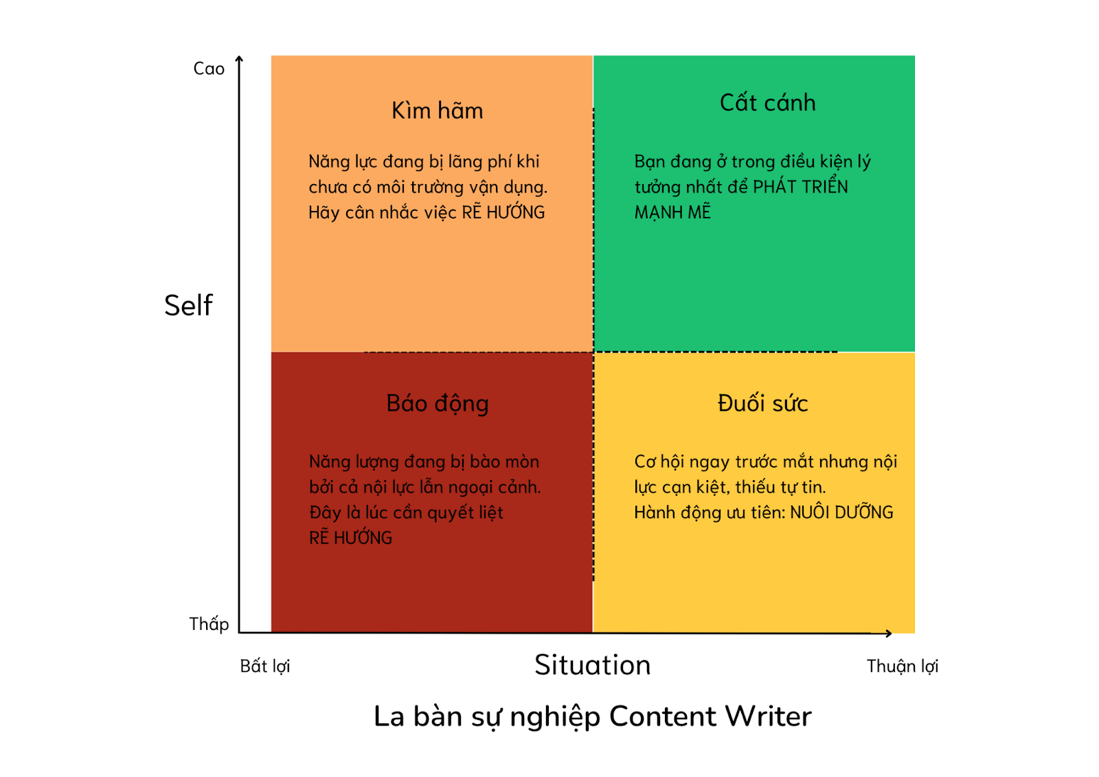 La bàn này được xác định bởi 2 trục: Nội lực cá nhân (Self) và Cơ hội từ môi trường (Situation), tạo thành 4 "vùng đất" sự nghiệp mà bất kỳ người viết nào cũng có thể đang ở trong đó: